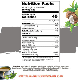 Active ingredients: Organic Arabica Coffee, Organic MCT, Coconut Oil, Starch Sodium Octenylsuccinate, Pantothenic Acid (B5), Pyridoxine (B6), Thiamin, Methylcobalamin (B12), Methylfolate, Folic Acid (B), Cholecalciferol (D3), Silicon dioxide.