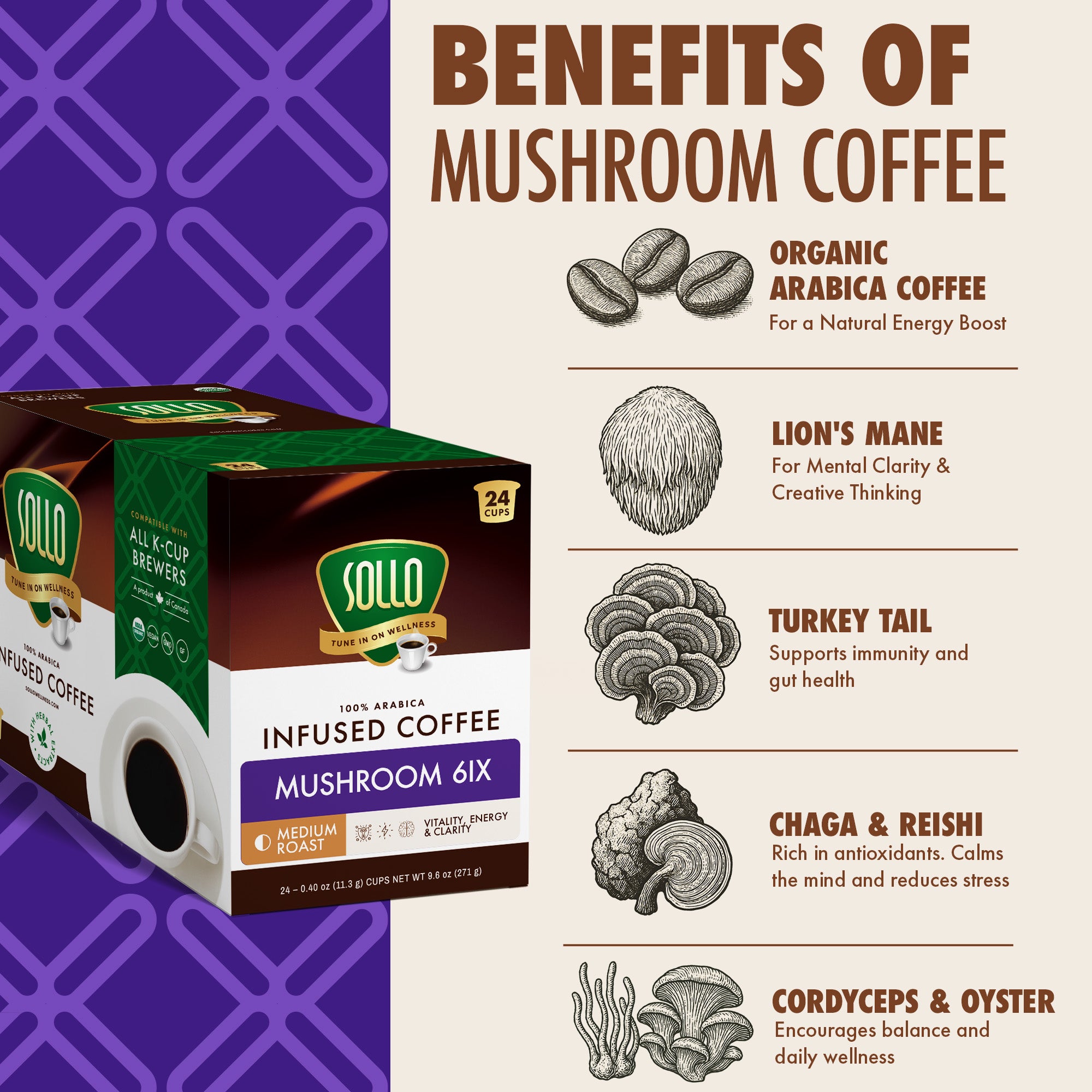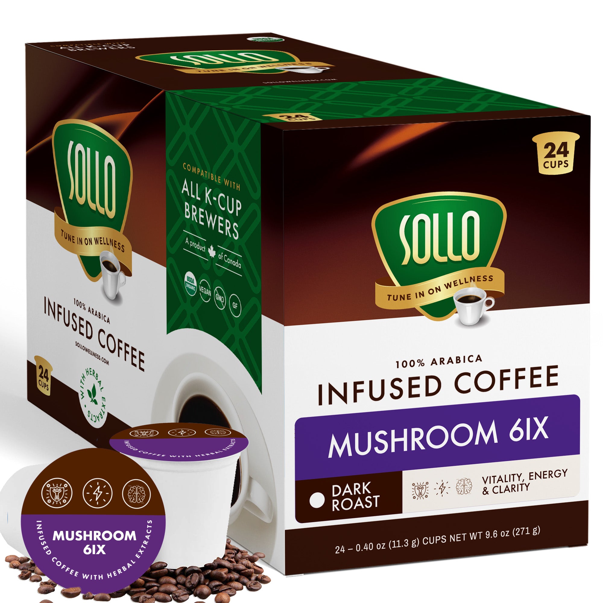 Sollo Infused Super Mushroom Coffee Pods combine the ease of Keurig-compatible brewing with the rich, full-bodied taste of 100% Arabica coffee—infused with a curated blend of six functional mushrooms: Lion’s Mane, Chaga, Reishi, Cordyceps, Turkey Tail, and Oyster. Each pod is also enriched with B1, B5, B6, B9, B12, and D3 to complement your coffee moment. With no added sugar and clean ingredients, these pods deliver a modern twist on a traditional favorite—quick, clean, and ready to brew in any K-Cup style machine.