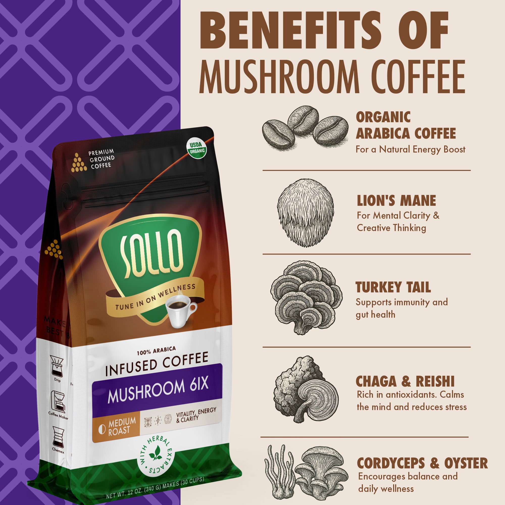 Sollo Infused Super 6 Mushroom Ground Coffee brings together the smooth richness of medium-dark roasted 100% Arabica beans and a curated blend of six mushrooms: Lion’s Mane, Chaga, Reishi, Cordyceps, Turkey Tail, and Oyster. Each 12 oz bag is also made with added B1, B5, B6, B9, B12, and D3 to complement your coffee experience.
